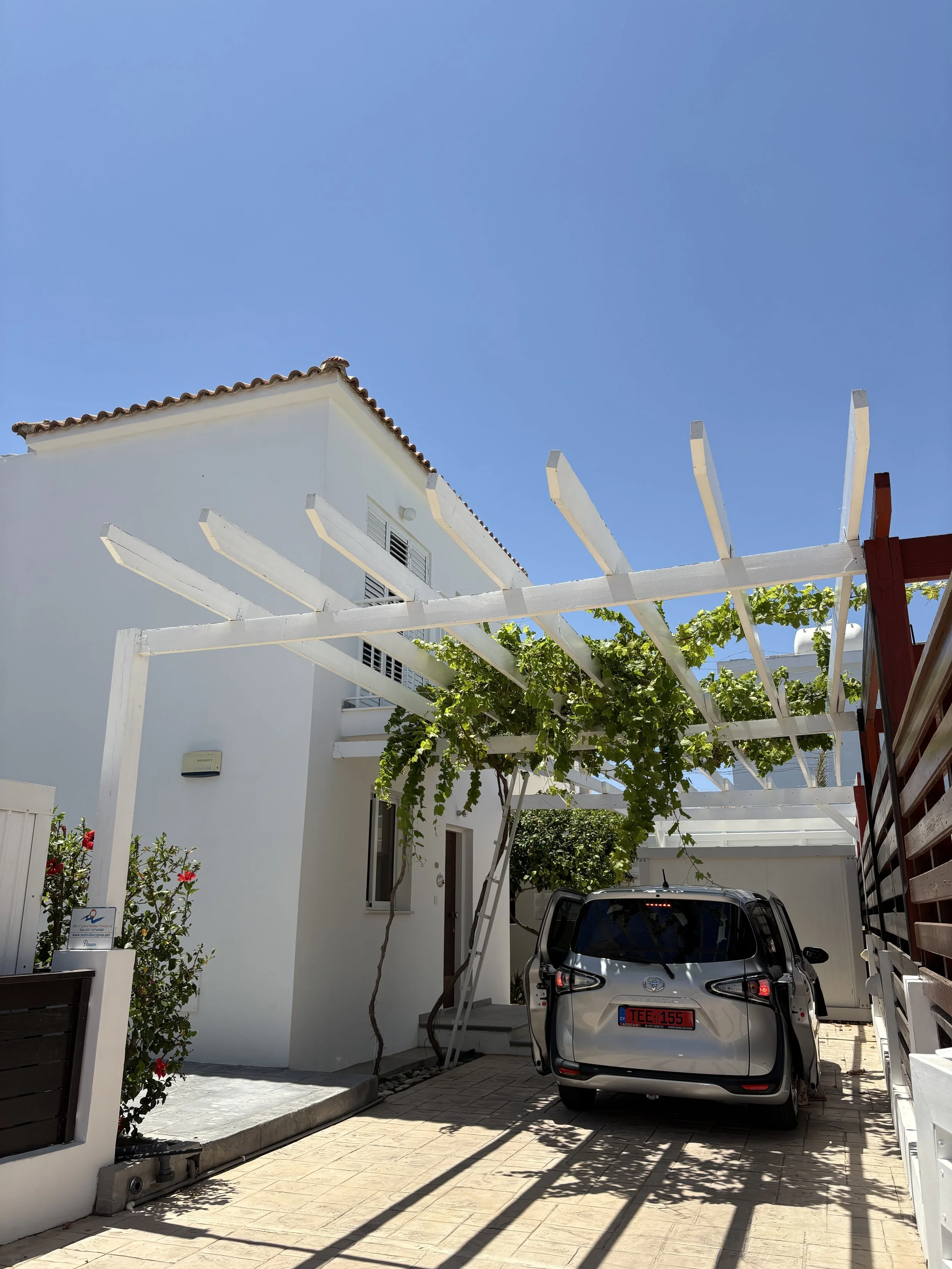 Villa sijaitsi tosi lähellä rantaa, ja pientä kävelykujaa pitkin lähin taverna ja kauppa sijaitsivat parin minuutin päässä, ja muita löytyi heti niiden vierestä. Villassa oli kolme siistiä ilmastoitua makuuhuonetta ja kolme vessaa, joista kahdessa oli suihku, sekä kivan pihan grilleineen ja uima-altaineen. Keittiöstä löytyi kaikki tiskikoneesta pyykkikoneeseen ja kahvinkeittimistä leipägrilliin. Sekä olohuoneessa että ulkona katoksessa oli pöytä, jossa kuusi henkeä söi helposti. Olimme majoitukseemme todella tyytyväisiä, ja villan managerin sai helposti kiinni whatsapilla. Homma siis niin sanotusti toimi. Arvostan.