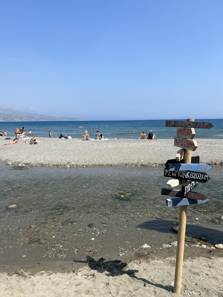 Mutta kuten aika usein, nytkin päämäärä palkitsi vaivannäön. Prevelin ranta oli aivan tosi upea, ja se jakautui palmumetsän vieressä, joenuoman lähellä olevaan perherantaan, ja sen takana Suoraan etelään avautuvaan isoon rantaan. Kreetan eteläpuolella oleva merialue on Libyanmeri, ja se kertoo siitä, että seuraava vastaan tuleva manner on Afrikka, tarkemmin Egypti ja Libya. Siksi aallot olivat selkeästi pohjoispuolta raffimmat ja meri kylmempi, mutta toki se näissä lämpötiloissa myös viilensi ihanasti. Pienimmille matkalaisille joenuoma oli kuitenkin kivempi uintipaikka, ja me isommat kävimme uhmaamassa Libyanmeren aaltoja.