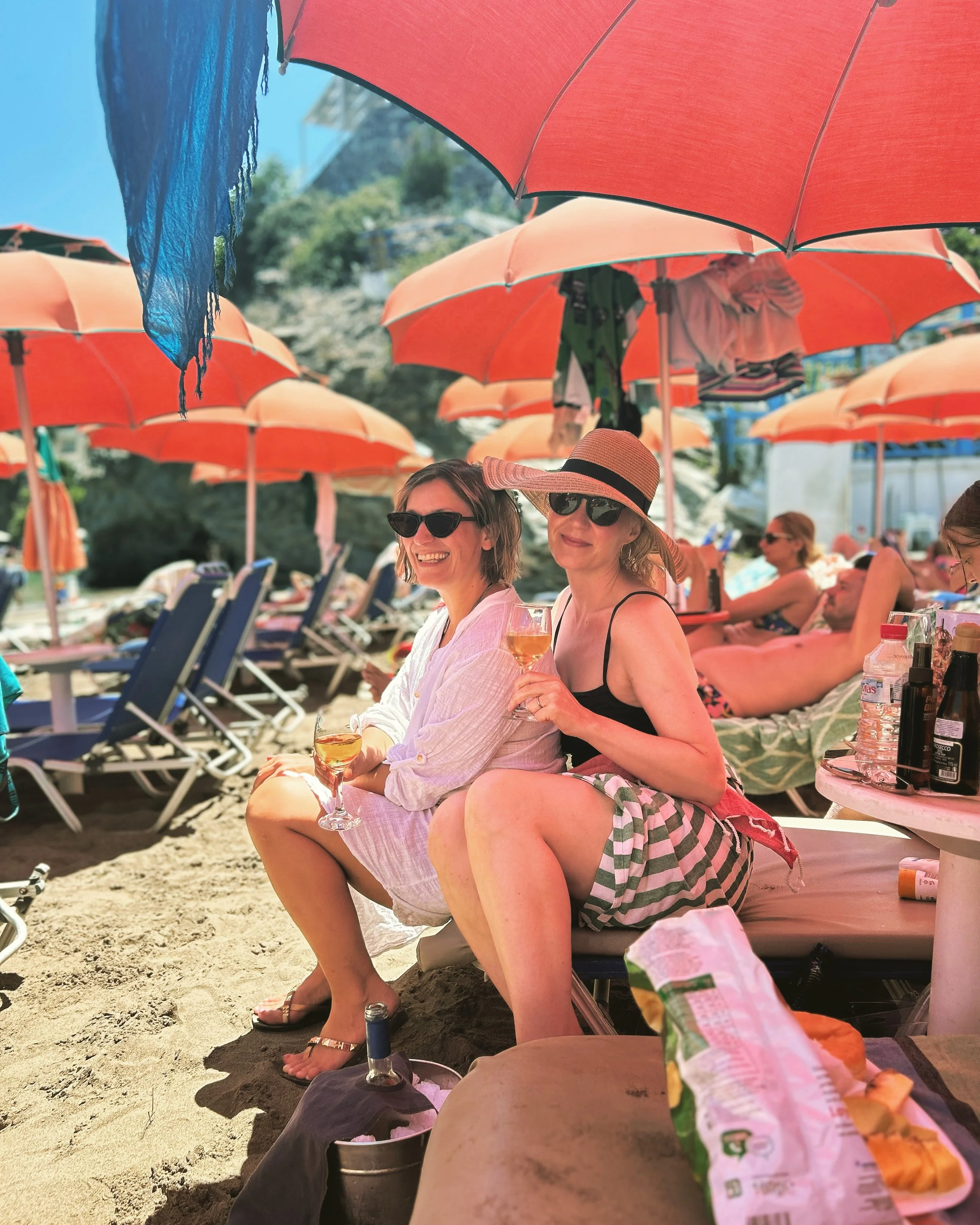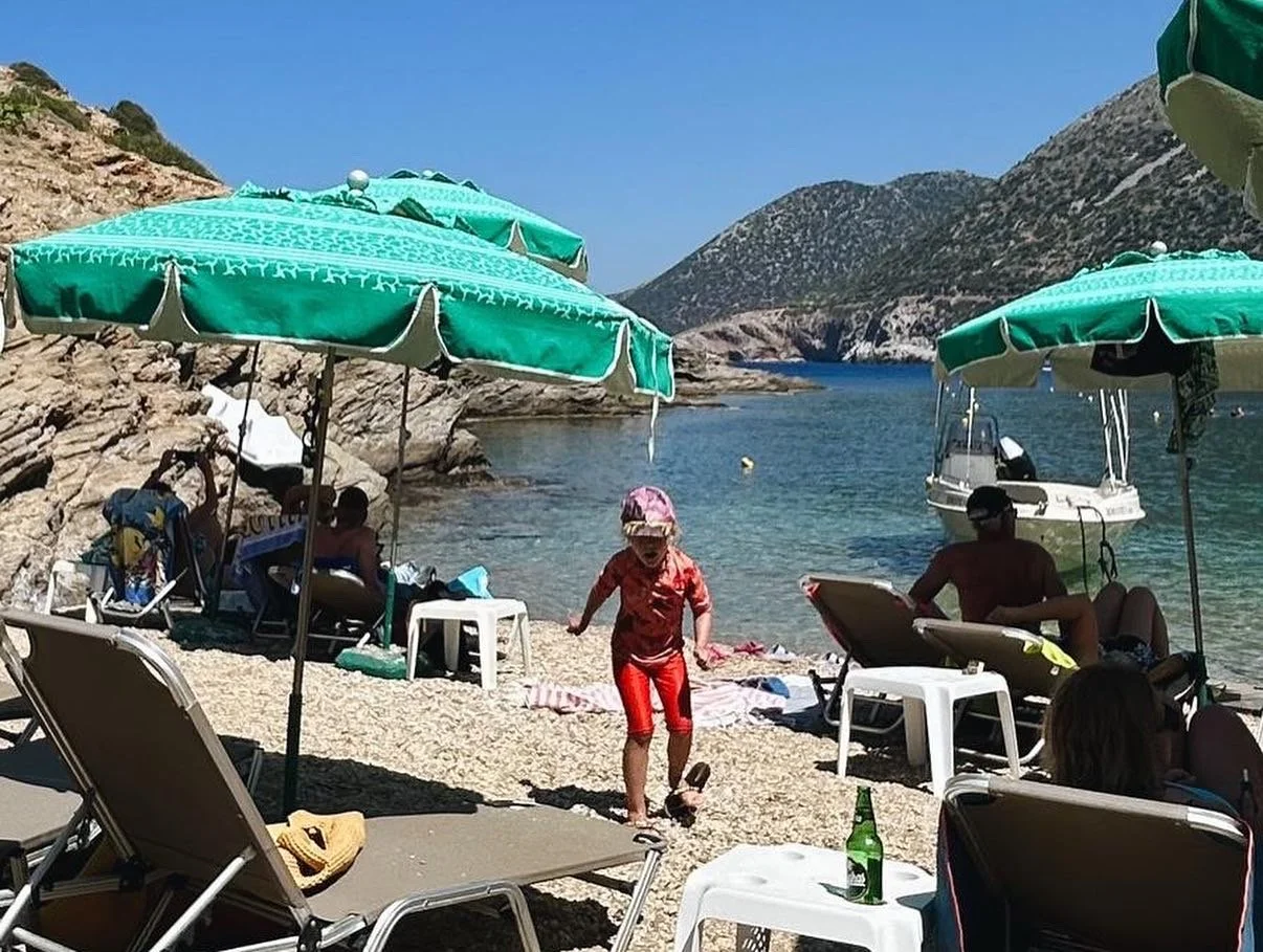 Livadi Beachille päädyimme vain kerran. Ranta ei tehnyt meihin varsinaisesti vaikutusta, vaikka sen ympäristössä olikin alueen paras ravintola- ja rantaclubitarjonta. Pari kertaa olimme ihan mahtavalla pitkällä lounaalla Livadilla, ja tyttäjen iltana me äidit istuimme muutamalla margaritalla rantaclubilla, mutta uimisten ja rantaelämän suhteen Livadi jätti meidät vähän kylmäksi. Toki se tosiaan oli meitä lähinnä, ja tilasimme sen ravintoloista pari kertaa ruokaa villalle, kun emme jaksaneet kokata, ja tämän lisäksi lähin ruokakauppa sijaitsi ihan Livadin alkupuolella, eli sinne pääsi menemättä varsinaisesti kylän puolelle. Mutta jos kaipaa rantalaiffia, johon kuuluu drinkkejä, rantalentopalloa, oleskelua auringossa ja sen suuntaista toimintaa, Livadi on tosi kiva. Snorkkeleita mukanaan kantavalle siellä ei ollut oikeastaan mitään näkemistä, vaikka yritimmekin koluta sitä ympäröivät kallioisemmat rannat ja etsiä katseltavaa.