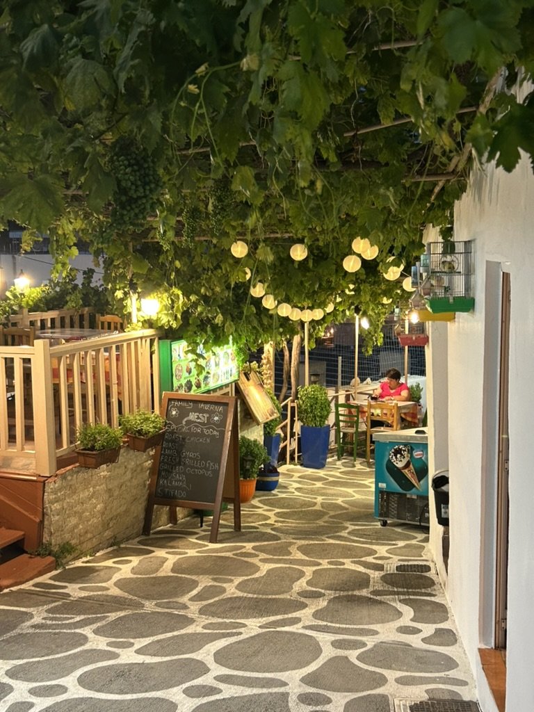 Toinen ihana ravintola oli pisin illallisemme muistaakseni juuri Stelioksen suosittelemassa ravintolassa, koska sen omisti joko hänen tätinsä tai setänsä tai joku serkun tyttärensä. Paikan nimi oli Family Taverna Nest, ja se sijaitsi kattoterassilla Balin keskustan yllä, ja istuimme siellä jonakin iltana monta tuntia. Sain täällä ehkä parasta moussakaa ikinä. Koskaan se ei ole Kreikassa huonoa, mutta täällä se oli niin hyvää, että kierin kaksin kerroin ravintolasta alas.
