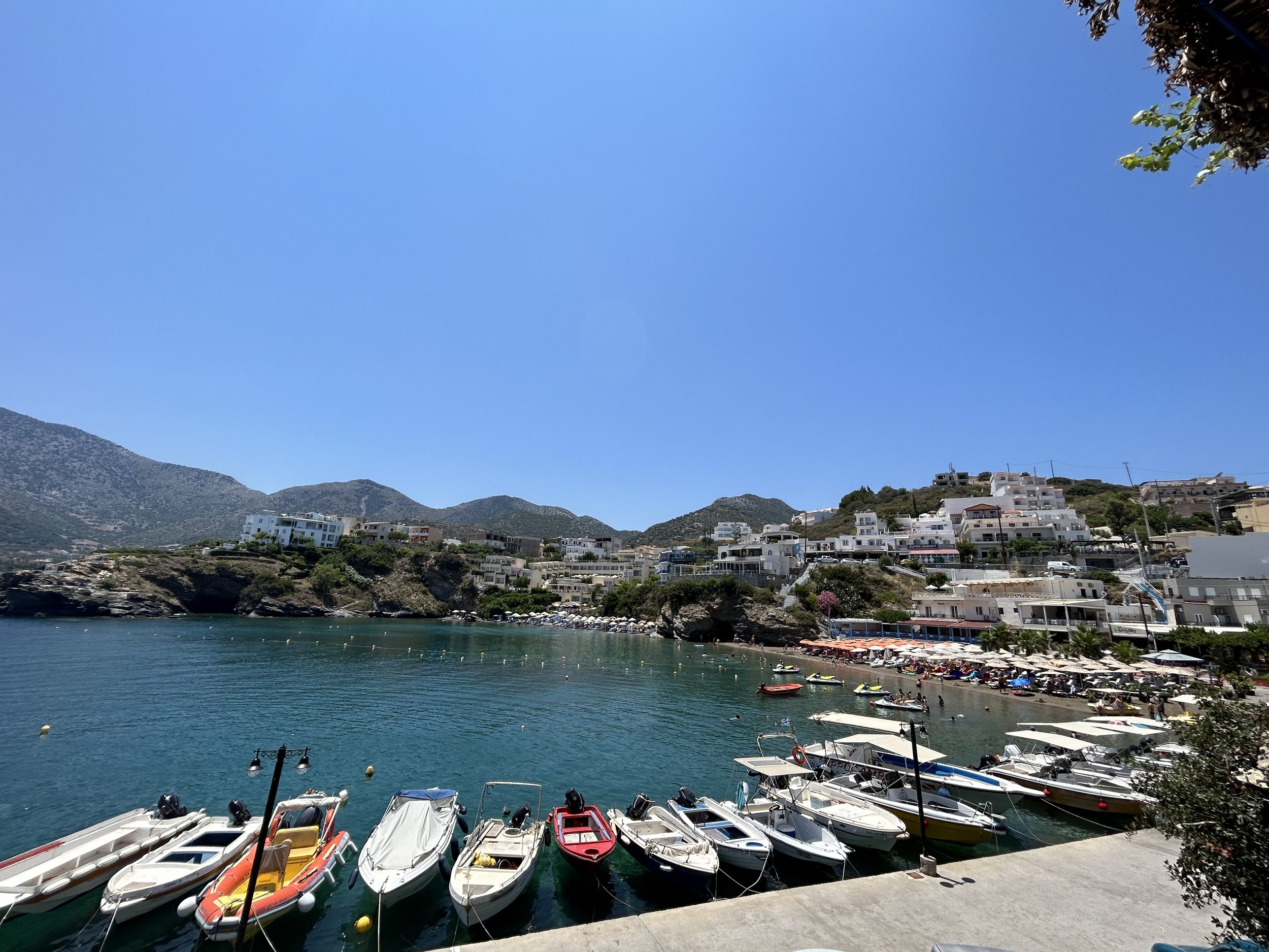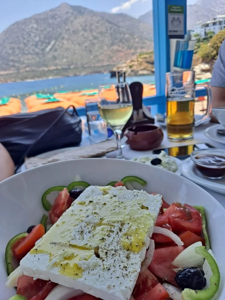 Tällä reissulla söimme kesimääräistä paremmin keskimääräistä huokemammalla. En tiedä, onko hintataso kahdessa vuodessa muuttunut paljon, mutta pari kesää sitten meidän kahdenksan hengen seurueemme söi lounaan helposti 80 €:lla (sisältää olutta ja viiniä), ja illalliseen saimme suurimmillaan kulumaan 140€, mutta silloin viiniä tuli karahvissa ja alkupaloja ja jälkiruokia syötiin surutta. Kävimme kahdesti Bali Beachin yläpuolen rinteessä sijaitsevassa Panorama-nimisessä ravintolassa. Sen näkymät satamaan, rantaan ja Balin keskustan yli olivat kertakaikkisen ihanat. Lisäksi ruoka ja palvelu oli kreikkalaisittain ylitsevuotavia. Tein kerran tilauksen auttavalla kreikan taidollani, ja sain ikuisia ystäviä, koska jokainen tarjoilija oli niin tohkeissaan turistista, joka oikeasti puhui kreikkaa. Toim. Huom.: puhun kreikkaa tosi vähän, sillä olen opiskellut sitä huimat puoli vuotta Duolingolla :)